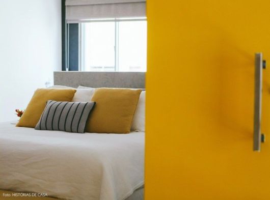 A porta colorida no quarto pode ser uma cor de contraste adicionando um detalhe de destaque no projeto. E nesse caso, uma boa alternativa é usar cor na parte que fica para dentro do quarto e manter a porta neutra para o lado de fora.
