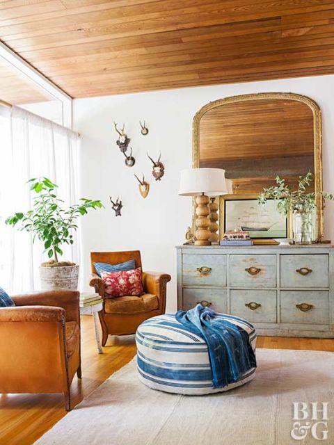 Para criar um ambiente harmônico, muitas pessoas tendem a inserir na decoração elementos em madeira como banquetas, por exemplo, para contrastar com o forro.
