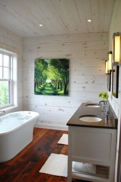 Para deixar a decoração do banheiro com ar de aconchego, o forro de madeira pode ser uma boa proposta.
