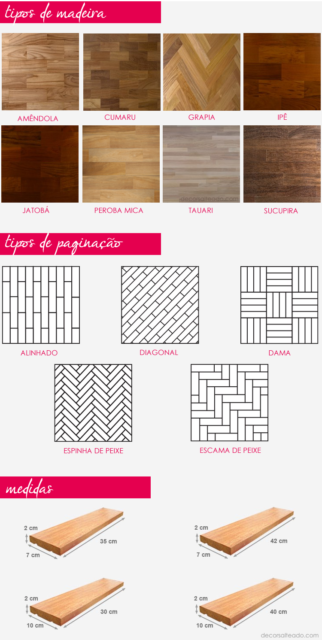 - Tacos de madeira com paginação criativa – Não podemos nos esquecer dos lindos pisos de tacos de madeira! Eles são muito usados ainda em ambientes internos como quartos e salas. O que tem estado na moda atualmente, no entanto, é a paginação deles, ou seja, qual é a disposição deles na superfície.Abaixo você pode ter uma noção dos tipos de madeira mais usados para os tacos, bem como os modelos de paginação interessantes para investir. Créditos da imagem: Decor Salteado.