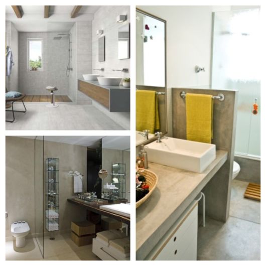 Além disso, você pode optar pelo concreto aparente, além do marmorato branco, que possui naturalmente manchas cinza. Outra ideia é instalar pastilhas no box ou na área da pia.