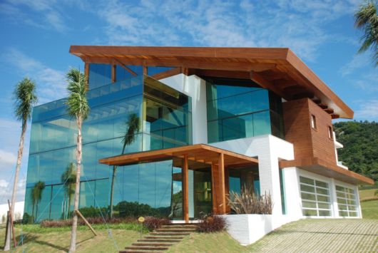 Alguns projetos inserem o conceito moderno na estrutura da casa fazendo um mix entre madeira e vidro. Oque deixa a fachada com ar poderoso, cheio de requinte!