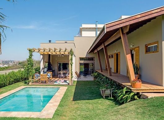 Nessa inspiração que separamos o pergolado de madeira foi utilizado para trazer um toque moderno e rústico para a edícula. A parede revestida com madeira super contrasta com o ambiente, sendo uma boa opção para quem está em busca de algo que remeta as casas de campo.