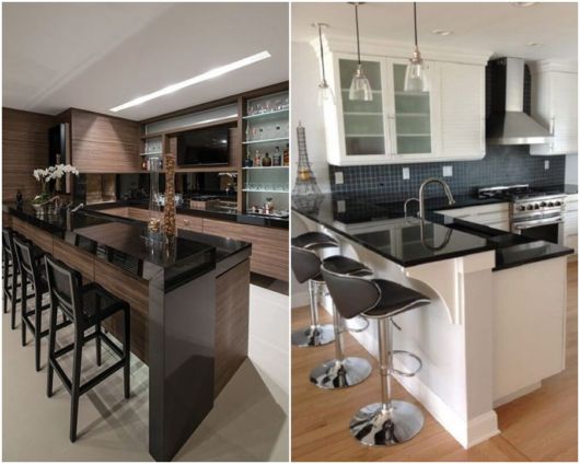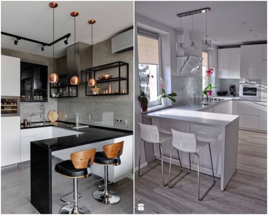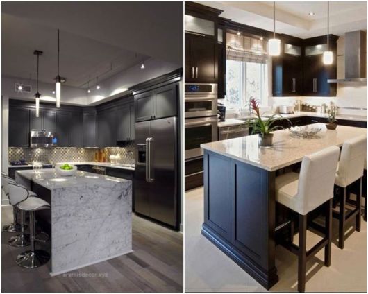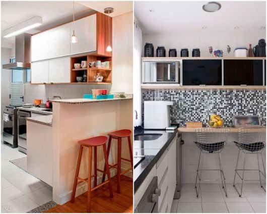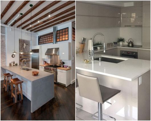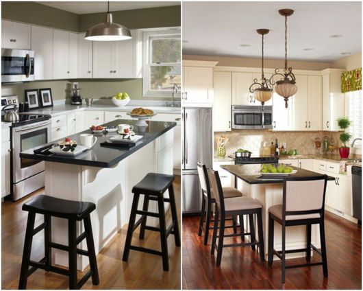 O espaço gerado pela disposição rente às paredes dos móveis e utensílios também libera espaço para dar um toque super moderno e charmoso à sua cozinha: a famosa ilha!