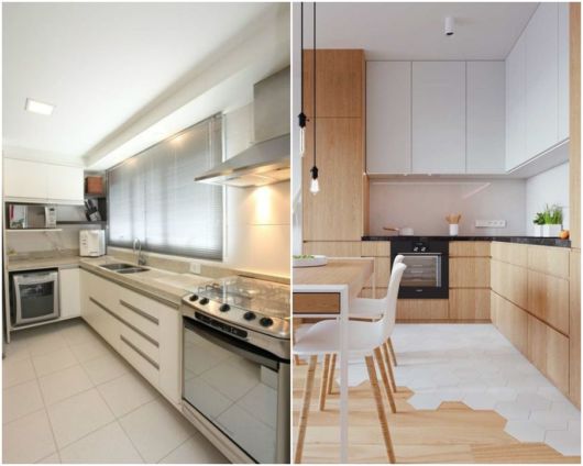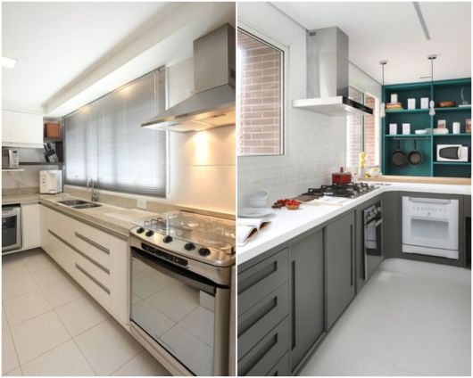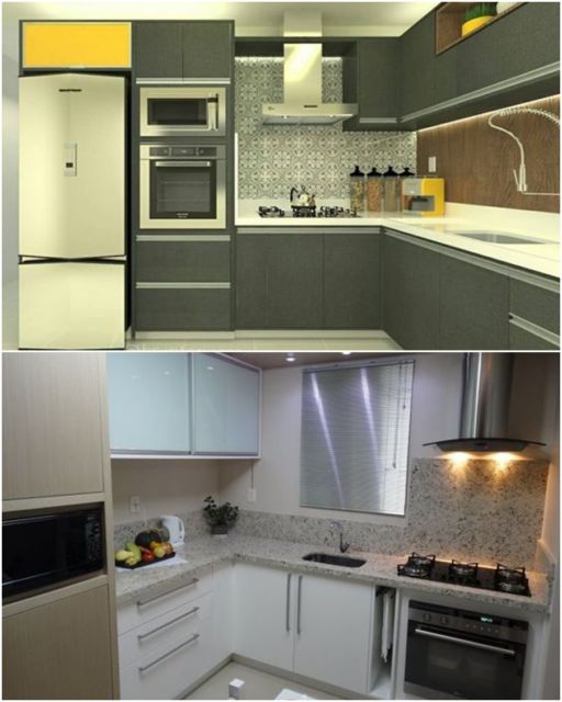 A dica para cozinhas em L pequenas está no minimalismo de itens e objetos decorativos. Além disso, janelas, espelhos e truque com cores são sempre bem-vindos.