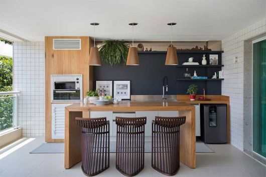 Desse modo, o preparo dos alimentos ficará muito mais fácil e prático. Além disso, você também pode planejar uma bancada especial para que as pessoas se sentem ao redor e desfrutem desses momentos.