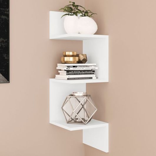 A prateleira de canto pode ser usada para dar diversos efeitos no ambiente, como amplitude e dinamicidade.