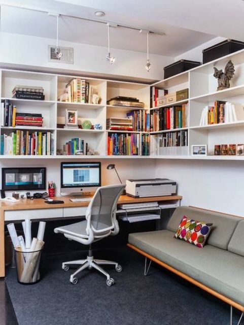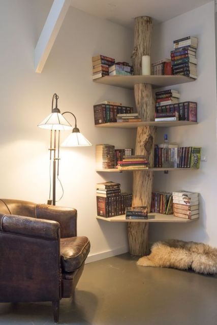 Organizar os livros em prateleiras de canto deixa tudo acessível e fácil de encontrar, além de poupar espaço e evitar bagunça!
