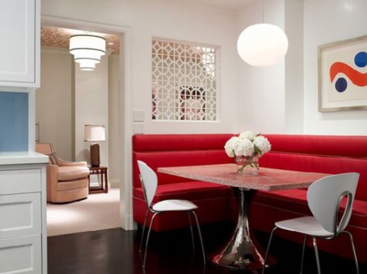 O sofá vermelho de canto também fica lindo e criativo em locais como sala de jantar ou cozinha. No entanto, é importante que o acabamento seja do tipo impermeável e fique longe do fogão.