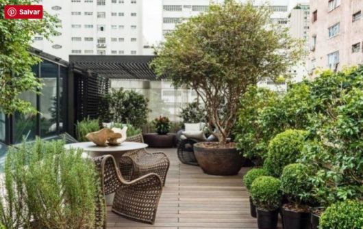 Neste lindo terraço, além de trazer o verde mais para perto com a criação desse lindo jardim, as árvores para jardim garantiram a privacidade dos moradores.