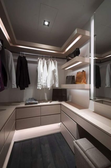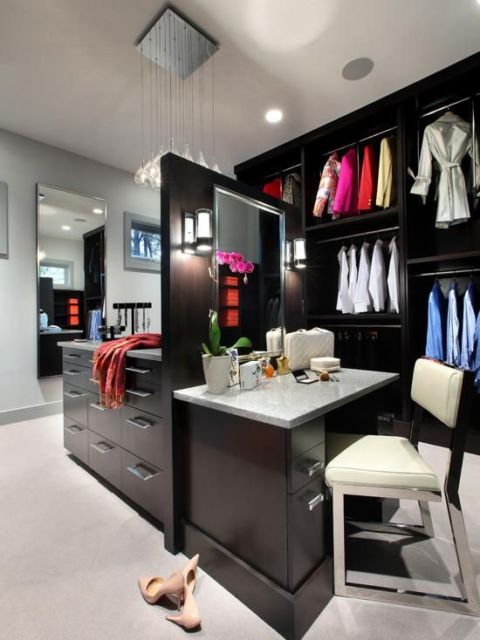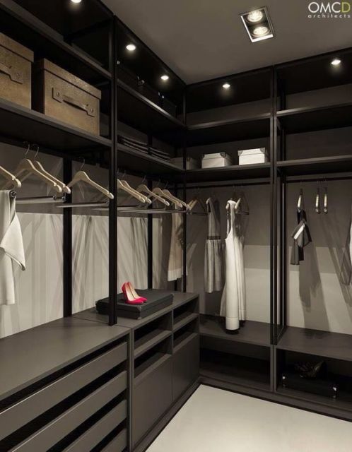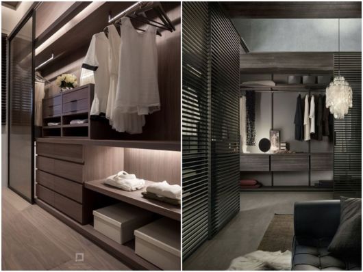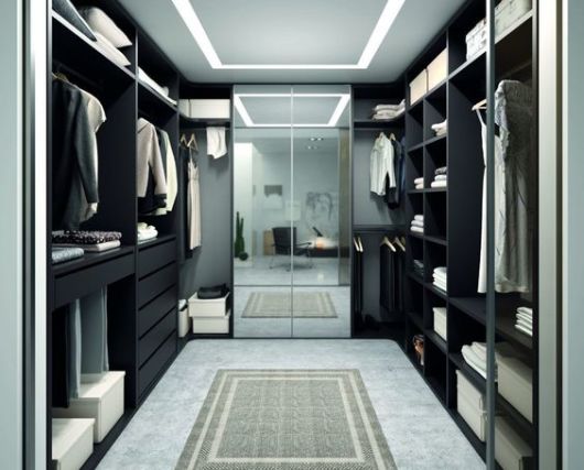 Já as cores escuras, como o preto, dão um ar de modernidade e sofisticação ao closet. Além disso, dão um aspecto de organização e uniformidade ao ambiente.