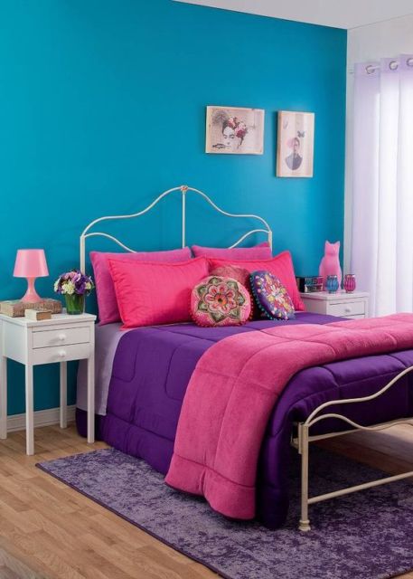 Para a composição do quarto feminino, esse projeto traz um quarto branco e rosa e o abajur roxo em destaque.