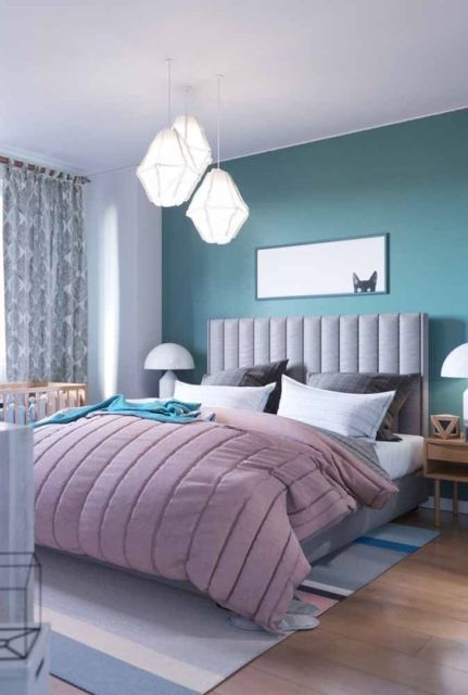 Como proposta decorativa para o quarto de casal, não é obrigatório ter abajures iguais em cada lado da cama, e vale brincar com a ideia de itens diferentes no design ou apenas na cor, como mostra essa ideia.