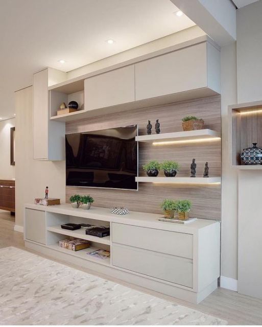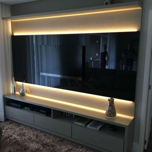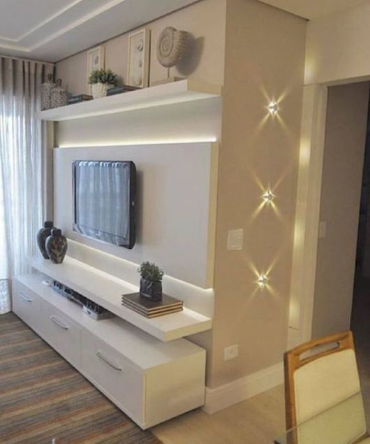 O rack para sala pequena com LED e luzes posicionadas estrategicamente se encaixam muito bem nesse tipo de decoração. As luzes dão um ar mais chique e moderno ao espaço, chamando a atenção de forma elegante para o item.