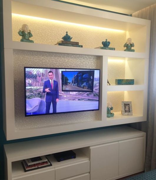 Nesse modelo, você pode posicionar a TV em cima do móvel ou então deixá-la suspensa sem painel. Desse modo, você valoriza o aspecto moderno do ambiente e deixa a parede como fundo ou destaque.