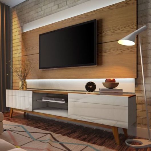 Já se você não deseja esconder a parede, as opções de rack sem painel também são bem variadas e elegantes!