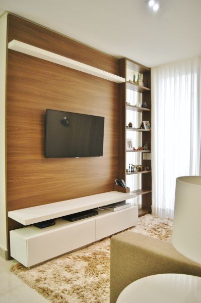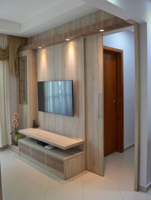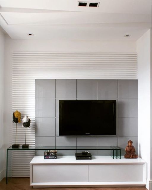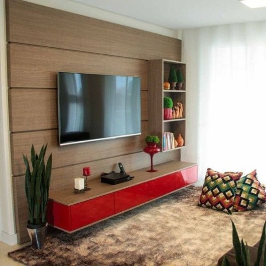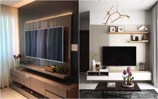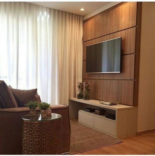 O painel dá um ar sofisticado e elegante para a decoração da sala, além de servir como suporte para objetos e TV.